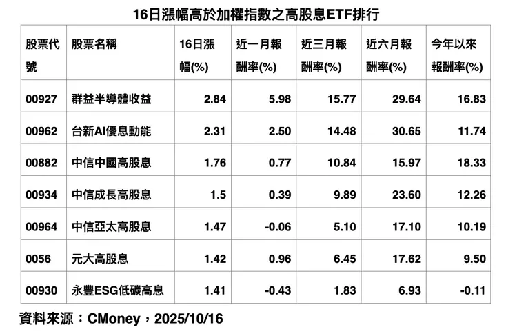 根據統計,16日漲幅勝過大盤的7檔高股息ETF依序為群益半導體收益(00927)上漲2.84%、台新AI優息動能(00962)上漲2.31%、中信中國高股息(00882)上漲1.76%、中信成長高股息(00934)上漲1.5%、中信亞太高股息(00964)上漲1.47%、元大高股息(0056)上漲1.42%,以及永豐ESG低碳高息(00930)上漲1.41%。這波上攻反映AI與高息題材同步發酵,不僅顯示電子股漲勢整齊,亦突顯資金對收益型標的的青睞。
