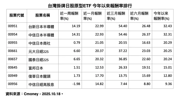 進一步觀察在台掛牌的日股ETF表現,今年以來報酬率全數為正,其中又以中信日本半導體(00954)、台新日本半導體(00951)績效逾3成表現最佳;此外,股神巴菲特青睞的日本商社,今年以來股價也持續創高,帶動中信日本商社(00955)績效逾2成。至於追蹤日經225指數的國泰日經225(00657)、元大日經225(00661)績效亦有逾2成的好表現。