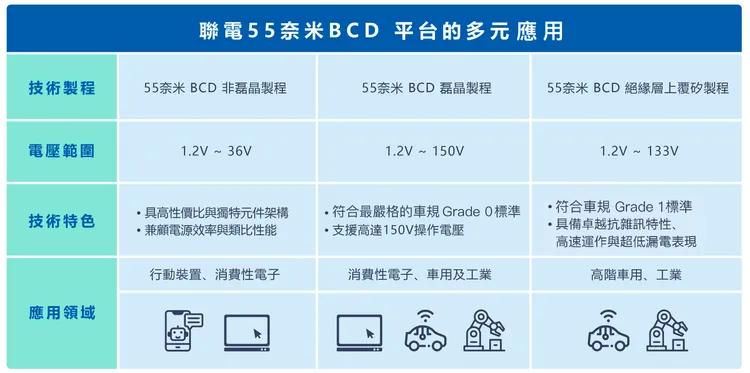 BCD技術可在單一晶片上整合類比、數位與電力元件,是電源管理與混合訊號IC的關鍵製程。聯電最新的55奈米BCD平台提供多元化解決方案,滿足不同應用對效能與可靠度的需求。