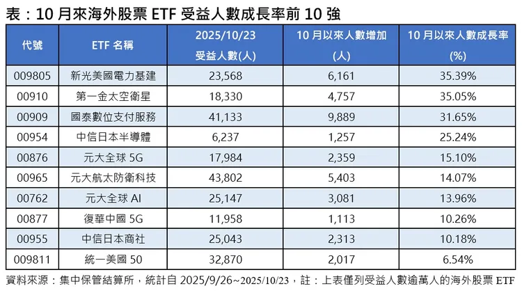觀察個別ETF,新光美國電力基建(009805)、第一金太空衛星(00910)、國泰數位支付(00909)等受益人數皆在10月成長逾三成,顯示市場買氣集中在電力與基礎建設、太空通信與支付科技等強勢題材。