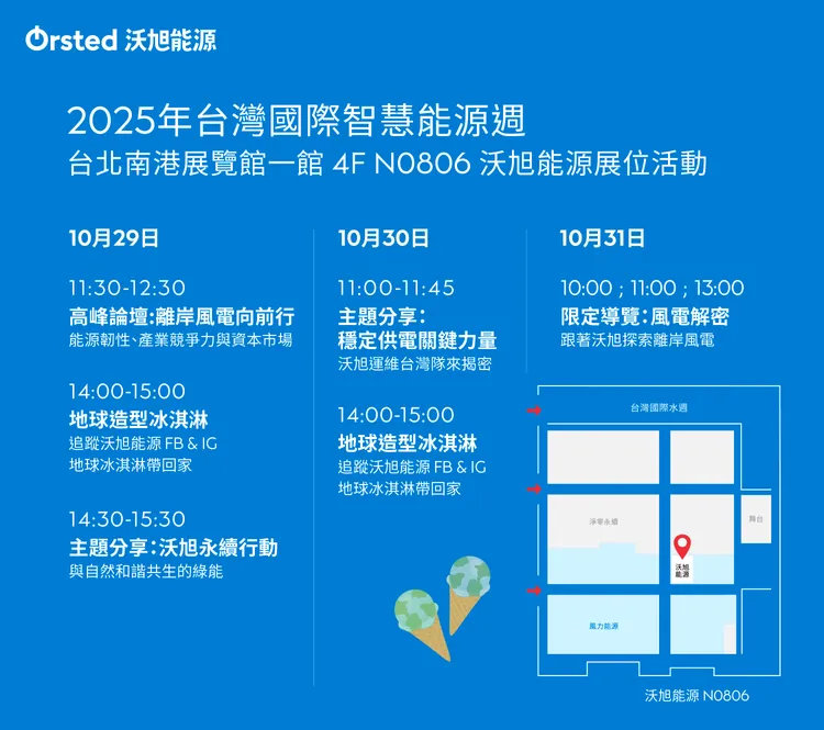 沃旭特別打造沉浸式海底世界投影空間,帶領參觀者了解珊瑚育生可行性研究的進展。每年獨家限量的「地球冰淇淋」也再次登場,展位結合視覺、聽覺與味覺體驗,讓大家感受沃旭全力發展離岸風電的同時,亦不忘兼顧氣候行動、生態保護與社區共榮的努力,展現離岸風電多元永續價值。
