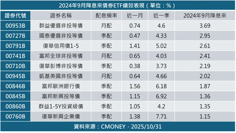 觀察原型債券ETF自2024年9月降息以來的含息報酬表現,僅有20檔逆勢繳出正報酬。值得注意的是,表現前十強的債券ETF中,就有5檔為非投等債,其中群益優選非投等債ETF(00953B)以上漲3.69%的好表現,奪下績效冠軍。