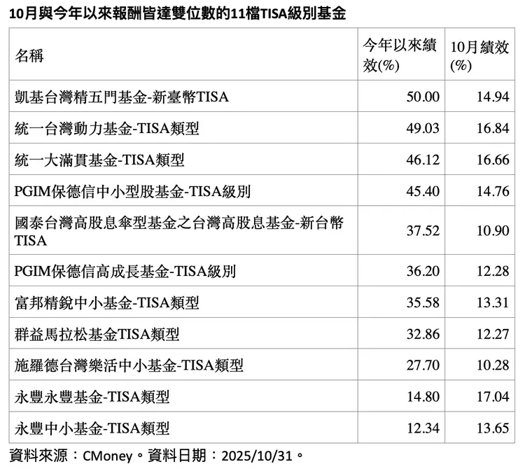 根據統計,目前市面上共有21檔以台灣為主要投資標的的TISA級別基金,10月單月績效介於1.7%至17.04%之間,其中11檔報酬率達雙位數;若觀察今年以來表現,績效介於1.7%至50%,有13檔基金報酬達雙位數,顯示整體市場表現亮眼。