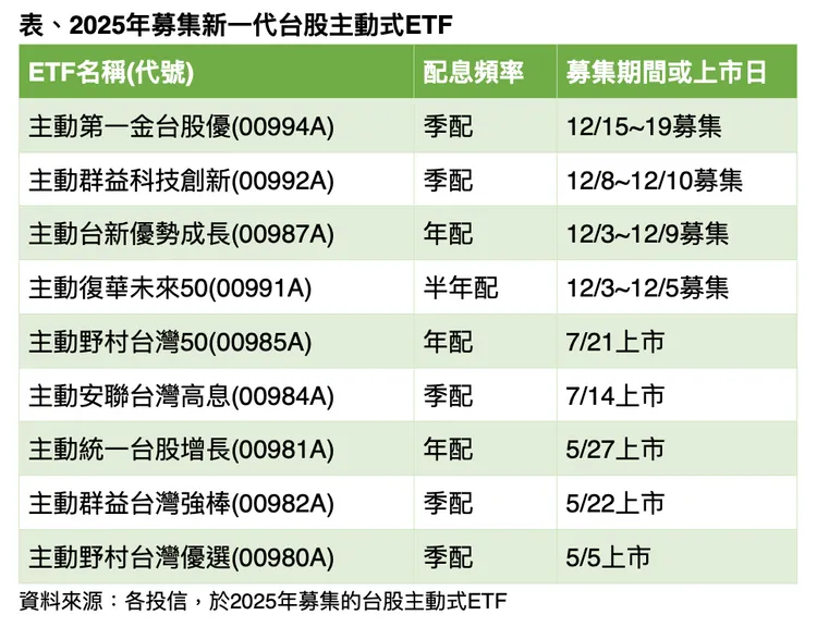 今年主動式ETF掀起新潮,首波集中於上半年發行,12月將再迎來第二波募集潮,包含主動復華未來50(00991A)、主動台新優勢成長(00987A)、主動群益科技創新(00992A),以及主動第一金台股優(00994A)等四檔產品。