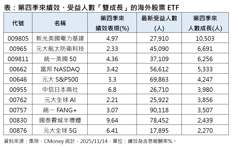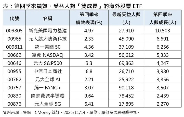 其中,新光美國電力基建(009805)、元太航太防衛科技(00965)、統一美國50(009811)、富邦 NASDAQ(00662)等十檔 ETF,不僅第四季績效表現強勢,受益人數更同步增加逾 5,000 人,成為市場追捧焦點。其他同樣在績效與人氣雙雙成長的 ETF,包括國泰費城半導體(00830)、中信日本商社(00955)、元大全球 5G(00876),第四季含息報酬皆突破 5%。