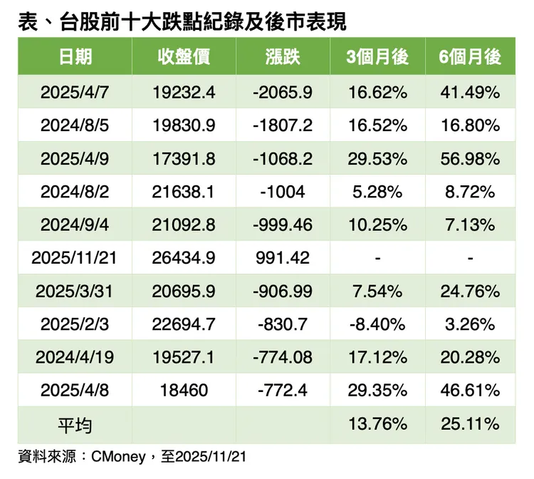台股 11 月初攻上 28,554 點後,遭遇國際市場修正及投資人獲利了結賣壓,今日單日下跌 991.42 點、跌幅 3.61%,為今年 4 月美中貿易緊張以來最劇烈的回檔。CMoney 資料顯示,目前台股自月初高點已修正逾 2,100 點。在此背景下,第一金投信分析歷史紀錄發現,從台股過去出十大跌點來看,若重挫後基本面無重大利空,指數 3 個月、6 個月後平均反彈幅度可達 13.76% 與 25.11%,顯示回檔往往成為中期行情起漲前的洗盤。