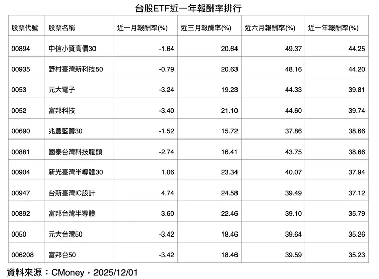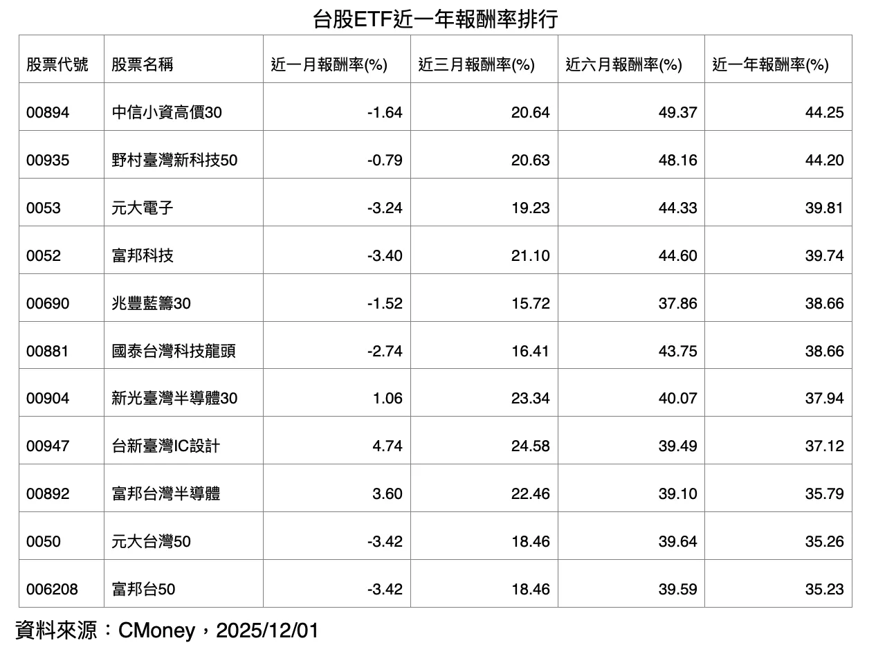 不過,含積量不高的 ETF 並不代表績效落後,甚至可能更強。以今年新掛牌的主動式 ETF「統一台股增長」(00981A)為例,含積量不到 10%,掛牌以來報酬卻高達 6 成,登上台股 ETF 年度績效王。而在被動指數型 ETF 中,中信小資高價 30(00894)同樣以含積量不到 3 成的配置,在近一年績效奪下被動 ETF 冠軍。