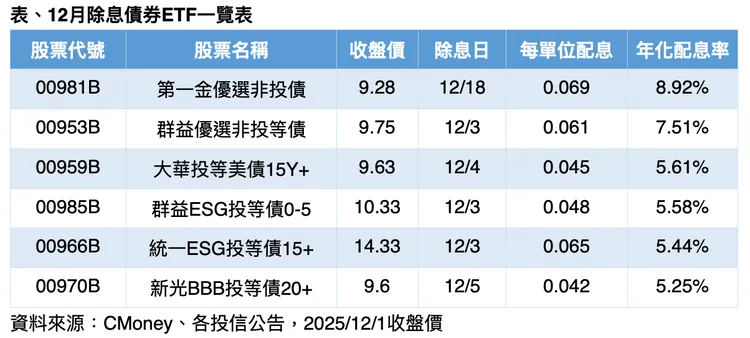 截至12月1日收盤,共有6檔月配息債券ETF公告12月除息,其中兩檔非投等債ETF配息最亮眼。00981B第一金優選非投債已連續第三個月每單位配息0.069元,年化配息率達8.92%居冠;其次為00953B群益優選非投等債,年化配息率7.51%。其他公告除息的投資等級債券ETF,年化配息率也均達5%以上。