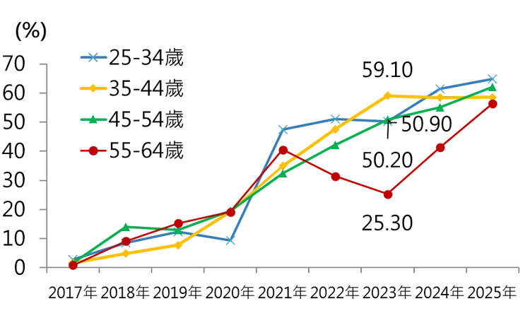 本次調查也持續觀察ETF投資行為,結果顯示ETF已成跨世代的重要理財工具。未退休族ETF使用率從2017年的1.96%跳升至2025年的59.9%;退休族也從1.44%攀升至40.6%,顯示ETF因透明、低成本、易操作等優勢,成為退休財務配置主流。其中年輕族群對ETF接受度大幅提高,已將其視為理財組合核心。