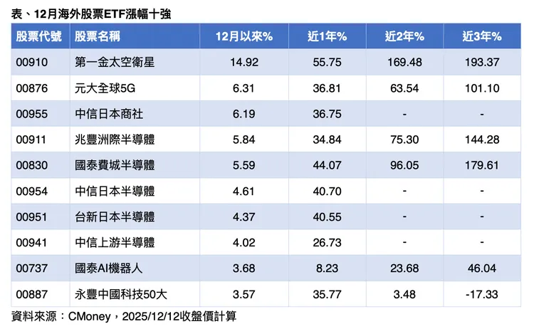 在市場震盪與政策解讀交錯下,12月以來海外股票ETF表現亮眼,其中第一金太空衛星漲幅逼近15%,中長線表現同樣突出,近一年、兩年與三年漲幅分別達55.75%、169.48%與193.37%,明顯優於多數海外ETF。同期表現突出的還包括全球5G、日股與半導體題材,如元大全球5G、中信日本商社、兆豐洲際半導體與國泰費城半導體等。