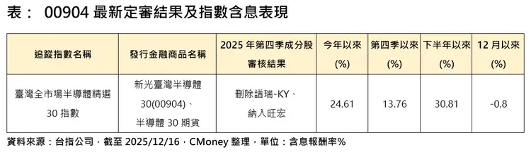 臺灣指數公司隨即配合新制,於9月5日公告調整「臺灣全市場半導體精選30指數」,追蹤該指數的新光臺灣半導體30(00904)亦於12月16日完成指數調整與換股,自12月17日起,最大成分股台積電權重由原先30%上限拉高至約4成。