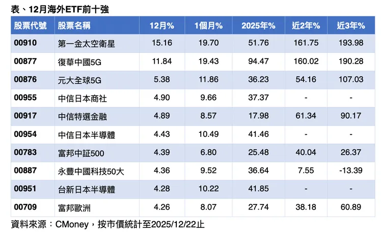 根據統計,12月以來表現最強勢的海外ETF題材包括太空科技、中國5G與日本商社概念。漲幅前五強依序為:第一金太空衛星(00910)+15.16%、復華中國5G(00877)+11.84%、元大全球5G(00876)+5.38%、中信日本商社(00955)+4.90%、中信特選金融(00917)+4.89%。