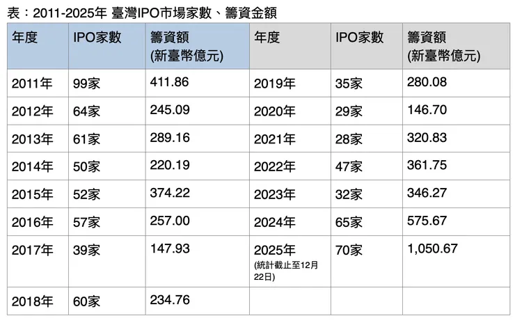 回到台灣市場,截至2025年12月22日,上市市場共有31家掛牌,雖較去年減少4家,但籌資金額達新台幣845.45億元,年增率高達98%。其中,半導體產業的鴻勁以344.69億元居籌資之冠,占上市籌資額40.77%;生技醫療業的禾榮科籌資108.54億元,占比12.84%,兩者合計逾五成。今年共有4家KY公司上市,合計籌資60.25億元。