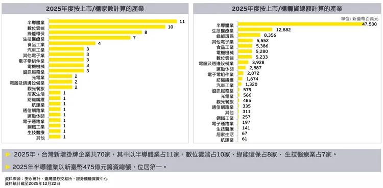 整體來看,2025年台灣上市櫃企業中,半導體產業共11家,籌資總額475億元,居各產業之首;另有81家企業申請興櫃,集中於生技醫療、其他電子及半導體產業,多層次資本市場發展趨勢持續深化。