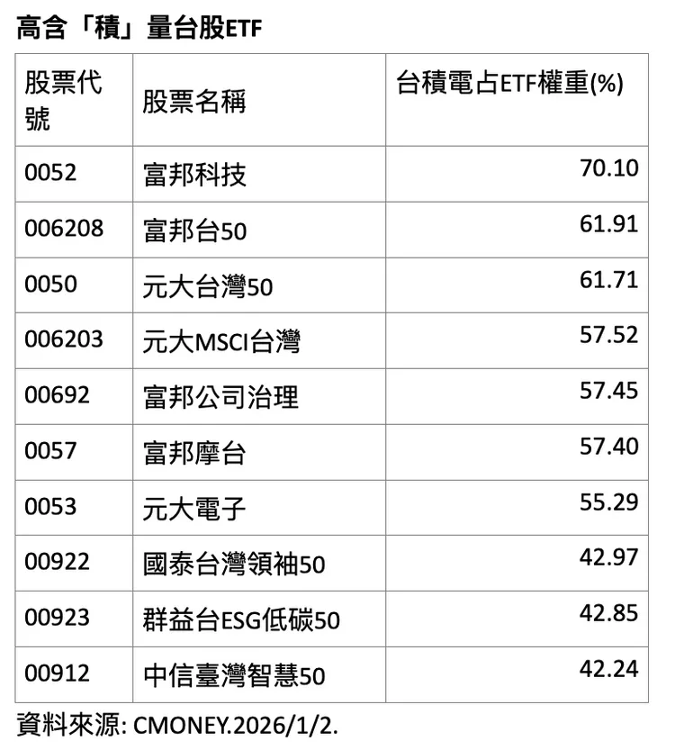 根據CMoney統計,截至2026年1月2日,台積電權重最高的ETF依序為富邦科技ETF(0052)、富邦台50(006208)、元大台灣50(0050)、元大MSCI台灣(006203)及富邦公司治理(00692),其中0052台積電占比高達70.1%,為市場中含「積」量最高的台股ETF。