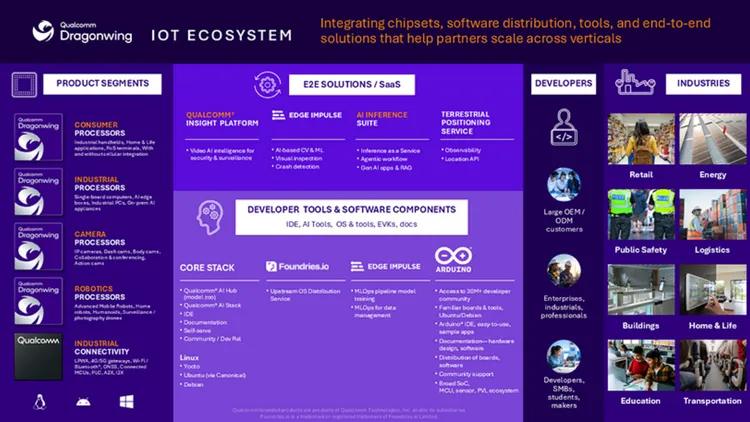在產品與平台層面,高通重新定義工業與嵌入式物聯網(IE-IoT)布局,透過差異化的Dragonwing產品線與統一軟體架構,同時支援Linux、Windows與Android,讓開發者能快速完成原型驗證,並直接走向規模化商業部署。結合Arduino的開源易用性,以及Edge Impulse與Foundries.io在機器學習與安全部署上的能力,高通正大幅降低物聯網與邊緣AI的進入門檻,加速從概念到量產的轉化速度。