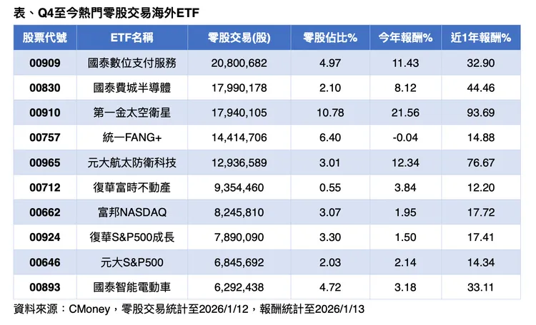 Cmoney資料顯示,自去年第四季以來,盤中零股交易最熱絡的海外ETF前五名,累計成交股數皆逾1,000萬股,依序為國泰數位支付(00909)、國泰費城半導體(00830)、第一金太空衛星(00910)、統一FANG+(00757)及元大航太防衛科技(00965),標的多聚焦在半導體、數位平台與太空產業等成長型科技主題。