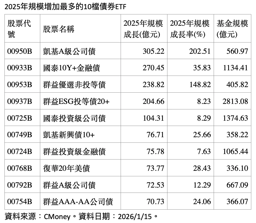 市場人士分析,規模增加金額前五名多以投資等級債為主,而成長幅度前五名則涵蓋不同債種;不過,無論以成長金額或成長幅度來看,表現最突出的皆為凱基A級公司債(00950B)。00950B主打A級信評,卻能提供接近BBB級債的票息水準,成功吸引資金進駐,推升基金規模自200多億元快速成長至500億元以上,也促使該ETF自成立以來第三度申請追加募集。