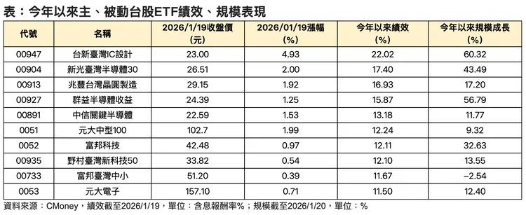 根據CMoney統計,今年以來截至1月19日,台股主被動ETF績效前五名全數由半導體ETF包辦,其中台新臺灣IC設計ETF(00947)年初以來上漲22%居冠,新光臺灣半導體30(00904)上漲17.4%居次,其餘包括兆豐台灣晶圓製造(00913)、群益半導體收益(00927)、中信關鍵半導體(00891),今年漲幅皆超過13%,明顯領先市值型與主動型ETF。