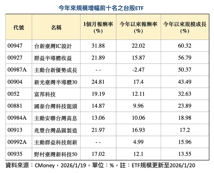 受惠記憶體權重高達三成,00947成為今年唯一規模成長超過六成的台股ETF。進一步觀察00947所追蹤的「臺灣指數公司特選臺灣上市上櫃IC設計動能指數」,在設計上具備高度選股彈性,成分股除涵蓋傳統IC設計公司外,亦納入IP、ASIC與記憶體IC設計族群,完整掌握產業動能。近期記憶體族群表現強勢,相關個股權重超過三成,成為帶動00947績效表現的關鍵因素,也使其躍居近期台股ETF績效王。