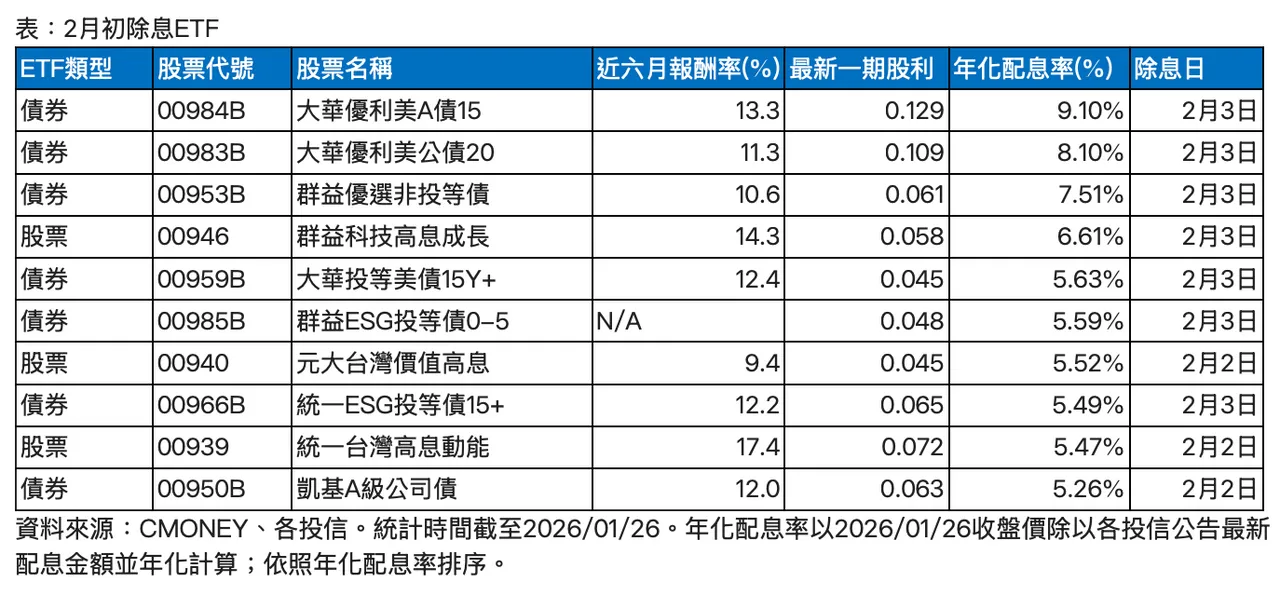 觀察2月初除息ETF名單,當中共有7檔債券ETF、3檔股票ETF,年化配息率表現以債券ETF較為突出,年化配息率前3高皆為債券ETF,分別是(00984B)大華優利美A債15、(00983B)大華優利美公債20以及(00953B)群益優選非投等債,其中00984B與00983B分別是信用評等較高的投資等級債以及美國公債ET,00953B則是信用風險較高的非投資等級債ETF。
