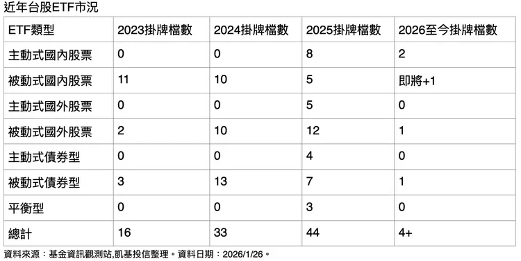 凱基投信表示,近年台股ETF市場快速擴張,觀察近三年新成立檔數呈現階梯式成長,2023年掛牌16檔、2024年增至33檔,2025年進一步成長至44檔。2026年開年以來,也已有多檔不同類型ETF掛牌,顯示投資人對ETF商品需求持續升溫。隨AI進入應用落地與生產力爆發的關鍵階段,台股有機會躍升為全球金融市場的重要舞台,ETF市場熱度可望同步攀升。