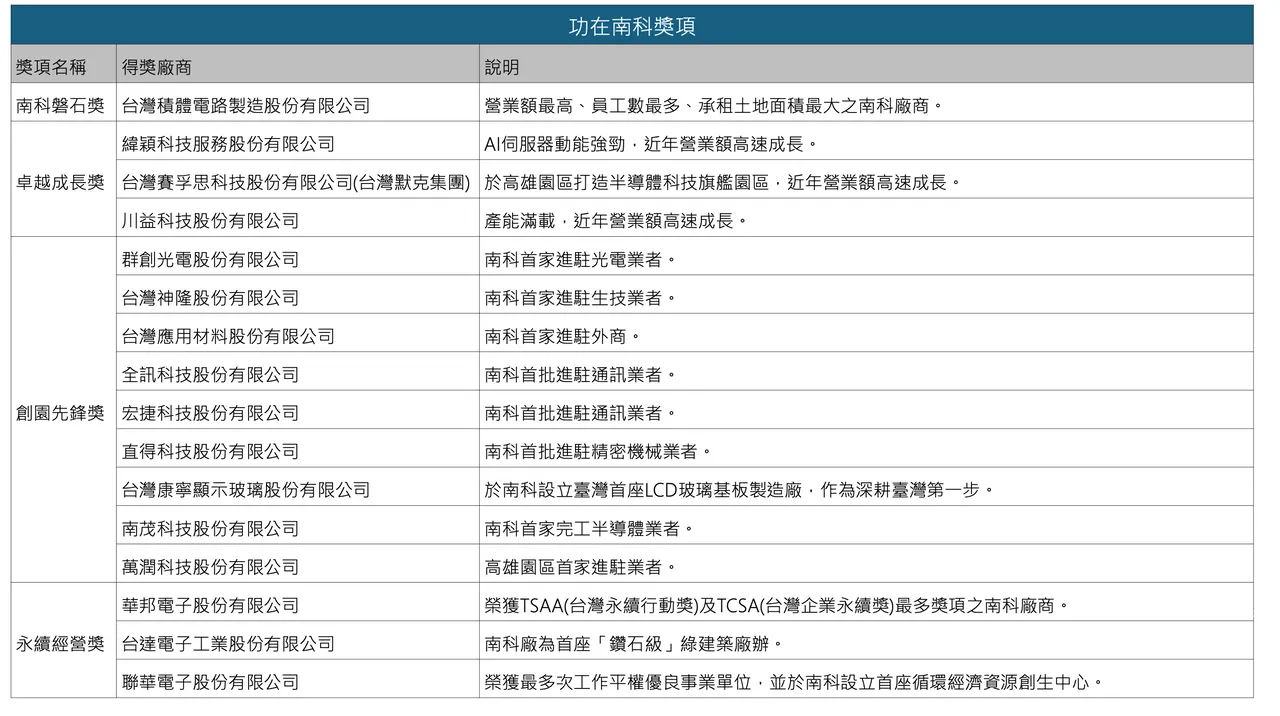 活動中亦舉行「功在南科」頒獎儀式,頒發南科磐石獎、卓越成長獎、創園先鋒獎及永續成長獎,表揚不同發展階段中,對園區建設與產業發展具關鍵貢獻的企業。