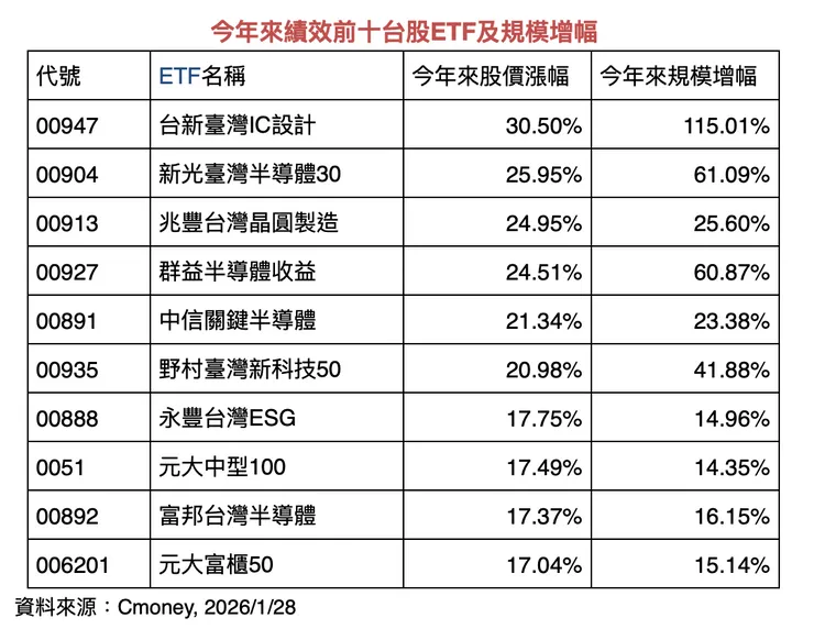 台股多頭延續,帶動科技型ETF表現持續升溫。市場統計顯示,今年來績效前十強台股ETF漲幅皆達雙位數,資金同步流入,規模成長率亦維持雙位數水準。其中台新臺灣IC設計(00947)受惠記憶體與IC設計族群同步走強,表現最為突出。