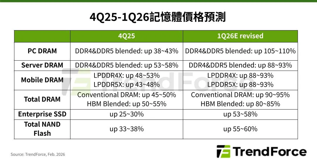 NAND Flash市場,TrendForce指出,原廠因看好DRAM獲利前景,持續將部分產線轉向DRAM生產,使NAND新增產能更為受限。在推論型AI(inference AI)需求帶動下,企業級SSD訂單自2025年底快速放量,買方提前囤貨推升價格,預估2026年第一季enterprise SSD價格將季增53%至58%,創下單季漲幅新高。