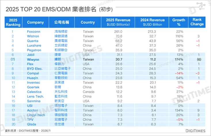 從個別企業來看,2025年前五大業者依序為鴻海、緯創、廣達、立訊與和碩。鴻海穩居第一,2025年營收達2,610億美元,年增22.4%,創2012年以來最高成長率,主要受惠於AI伺服器機櫃、模組與基板出貨放量,以及iPhone 17系列帶動的換機需求。