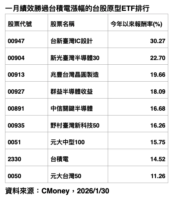其中,台新臺灣IC設計(00947)以30.27%報酬率居冠,其餘包括新光臺灣半導體30(00904)、兆豐台灣晶圓製造(00913)、群益半導體收益(00927)、中信關鍵半導體(00891)、野村臺灣新科技50(00935)等,含息報酬率介於16%至22%,不僅明顯優於台積電的14.52%,也勝過0050的11.26%。