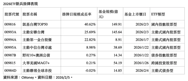 市場人士分析,7檔新兵中就有4檔以台股為核心投資標的,反映投資人對台股後市的高度期待。尤其掛牌當天規模即可出現雙位數成長,顯示資金積極進場,台股ETF新產品吸金力道明顯,也凸顯市場對台股中長期成長動能的信心。