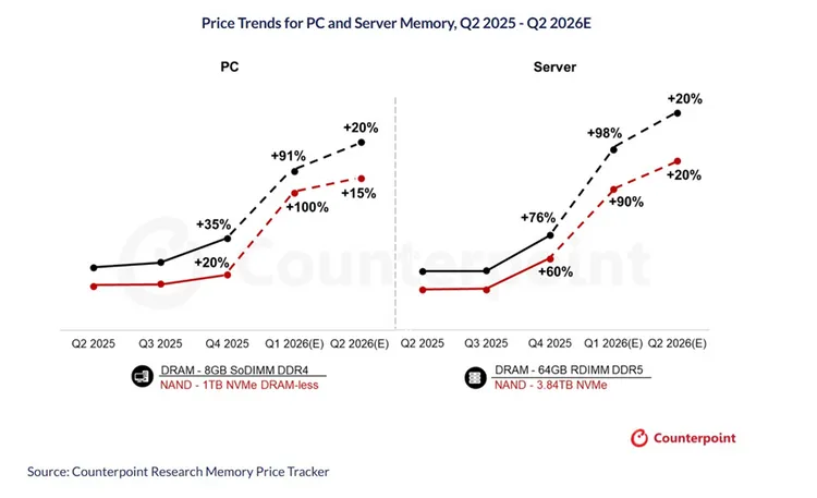 不僅DRAM走勢強勁,原本在2025年第四季價格相對穩定的NAND,也在今年第一季出現與DRAM同步的80%至90%漲幅。再加上部分HBM3e產品價格調升,帶動整體記憶體產品線全面上行,顯示供需結構已出現明顯轉變。