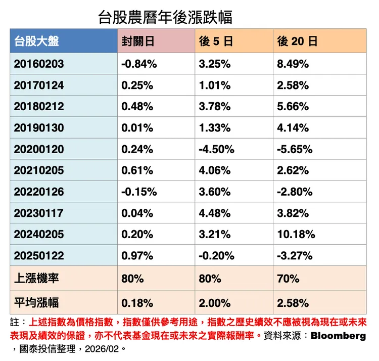 此外,國泰永續高股息(00878)預計於2月26日除息,最後買進日為2月25日,股息將於3月23日發放。00878基金經理人江宇騰表示,以近十年數據來看,農曆年後20個交易日大盤勝率約七成,平均報酬近2.6%,其中金融股勝率更高達八成,平均報酬約3.3%,表現優於大盤。對於擔憂短期波動的投資人而言,息收型台股ETF可作為較穩健的選擇。00878投組中約三成配置金融股、四成布局AI概念相關產業,在高息股支撐下,整體波動度相對低於大盤,同時仍可參與AI長線成長趨勢。