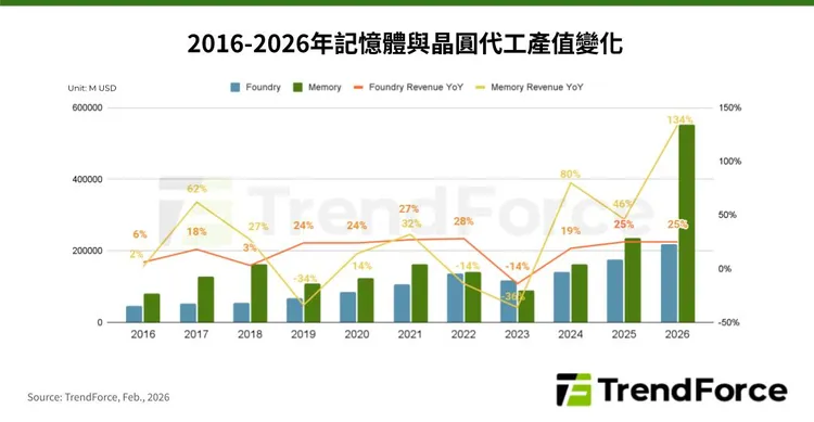 從產能擴張角度來看,記憶體產品標準化程度高、光罩層數較少,使資本支出轉化為實際產出的效率明顯優於晶圓代工。TrendForce指出,在AI需求未歇、短期供給缺口難以填補下,記憶體原廠仍握有高度定價主導權,預期記憶體產值增幅將持續領先晶圓代工產業。