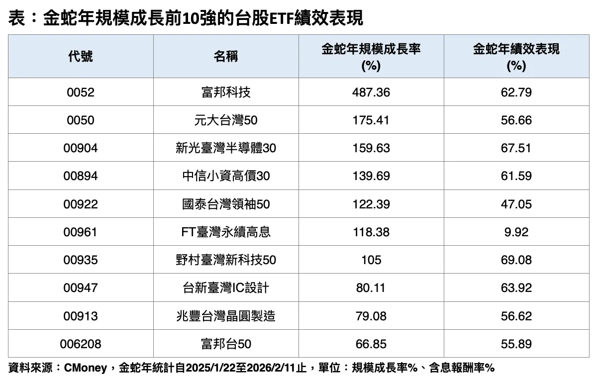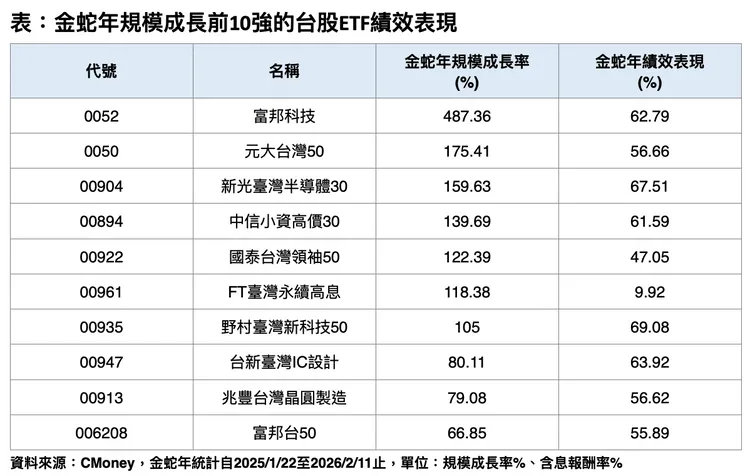 統計顯示,金蛇年期間(2025/1/22~2026/2/11)台股ETF吸金動能強勁,即便主動式ETF掀起市場話題,被動型ETF仍繳出亮眼成績單。包括0052、0050、00904、00894、00922、FT00961與00935等7檔台股原型ETF,規模成長率均突破100%。此外,00947、00913及006208等亦擠進規模成長前段班,顯示科技與半導體題材仍為資金主軸。