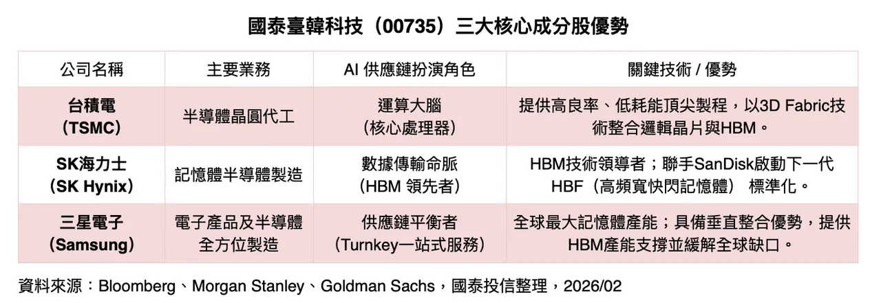 國泰臺韓科技(00735)布局AI硬體鐵三角,前三大持股為三星電子、台積電與SK海力士,近一年報酬達90.38%(2026/1)。相較多數台股ETF偏重單一市場,00735納入逾四成韓股科技權重,補足HBM與新世代儲存技術版圖。在韓股複委託門檻與成本較高情況下,透過ETF可一次掌握AI供應鏈三大核心,有望參與跨國AI硬體成長紅利。