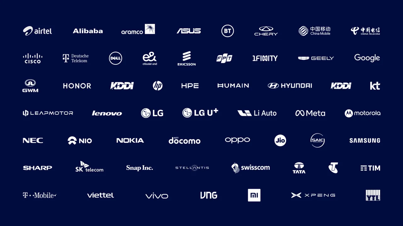 支持此聯盟的全球合作夥伴包括:Airtel、Amazon、華碩、BT Group、思科、戴爾、e&、愛立信、FPT Corporation、Fujitsu/1finity、Google、惠普、HPE、HUMAIN、KDDI、KT、LG電子、LG Uplus、Meta、微軟、摩托羅拉、NEC Corporation、諾基亞、NTT DOCOMO、Reliance Jio、三星電子、夏普、SK電信、Snap Inc.、Stellantis、Swisscom、Tejas Networks、Telstra、TIM Group、T-Mobile、Viettel Group、VNG,以及YTL。