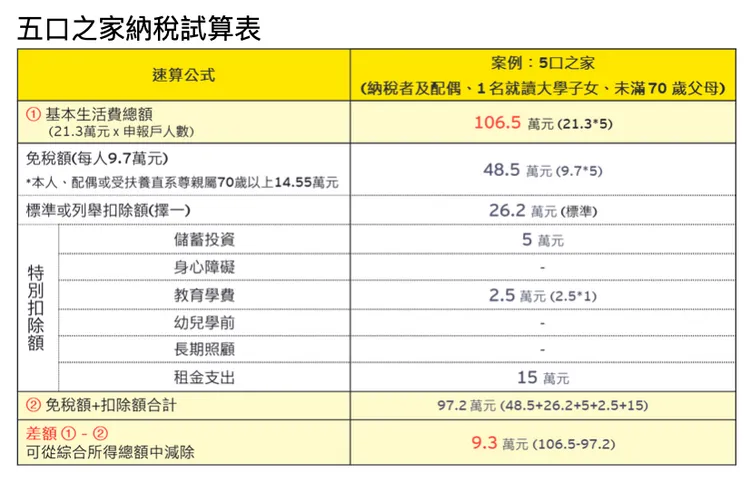 以五口之家為例,若成員包括納稅者及配偶、一名就讀大學的子女,以及未滿70歲的父母,家庭基本生活費總額為106.5萬元。若免稅額與扣除額合計為97.2萬元,兩者差額9.3萬元即可自綜合所得總額中減除,達到節稅效果。