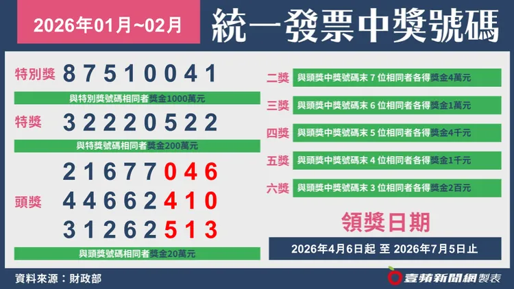【記者許麗珍/台北報導】快來對獎了!115年1、2月期統一發票今天(25日)開獎, 千萬元特別獎獎號出爐了,今天公布特別獎號碼為87510041 。財政部表示,1、2月份統一發票領獎期限為4月6日至7月5日。