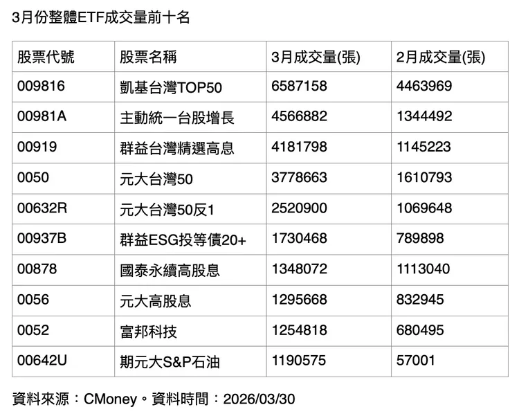 觀察目前市場逾280檔ETF,3月成交量前十名涵蓋多元類型,包括3檔市值型、3檔高股息、1檔主動式、1檔債券型、1檔反向與1檔期貨信託產品。人氣前段班則以009816、主動統一台股增長(00981A)、群益台灣精選高息(00919)、元大台灣50(0050)及元大台灣50反1(00632R)最受矚目。