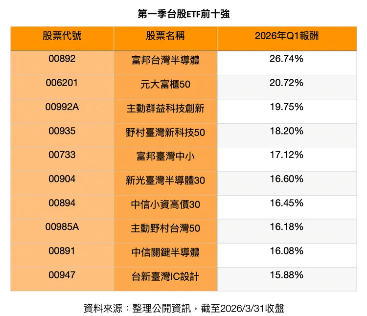 統計第一季台股ETF前十強,依序為富邦台灣半導體(00892)26.74%、元大富櫃50(006201)20.72%、主動群益科技創新(00992A)19.75%、野村臺灣新科技50(00935)18.20%、富邦臺灣中小(00733)17.12%、新光臺灣半導體30(00904)16.60%、中信小資高價30(00894)16.45%、主動野村台灣50(00985A)16.18%、中信關鍵半導體(00891)16.08%、台新臺灣IC設計(00947)15.88%,全面優於加權指數9.52%與櫃買指數10.23%。