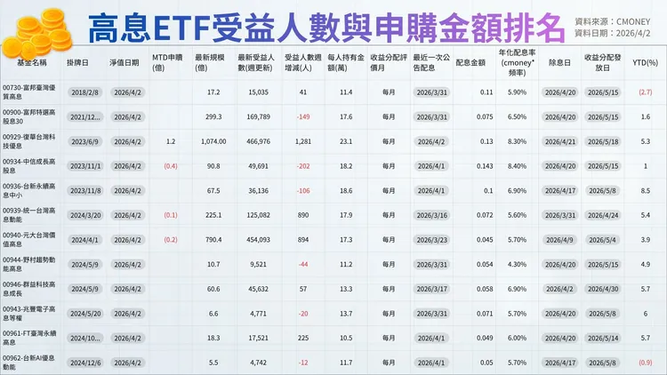 隨著高股息ETF產品持續增加,市場競爭逐漸加劇,但月配息機制仍具備吸引力。財經主播陳明君認為,對於希望兼顧資產穩定與現金流的投資人而言,這類產品仍具有配置價值,尤其近期美伊戰事干擾、聯準會利率政策未明朗下,高股息ETF在市場震盪時,更容易成為資金停泊的選項。不過高股息ETF未來仍需觀察利率走勢與資金動能,但短期內,配息題材在當前多變的投資大環境中,會持續受到關注。