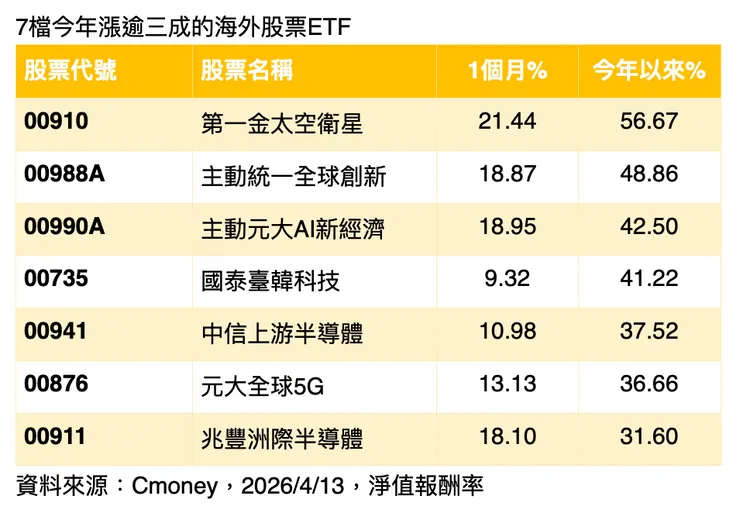 今年漲幅逾三成的海外ETF中,第一金太空衛星(00910)累計漲幅達56.67%,遙遙領先其他各檔主、被動海外ETF;漲幅逾四成的有3檔為主動統一全創新(00988A)、主動元大AI新經濟(00990A)、國泰臺韓科技(00735);漲幅達三成以上者則為中信上游半導體(00941)、元大全球5G(00876)、兆豐洲際半導體(00911)等3檔。