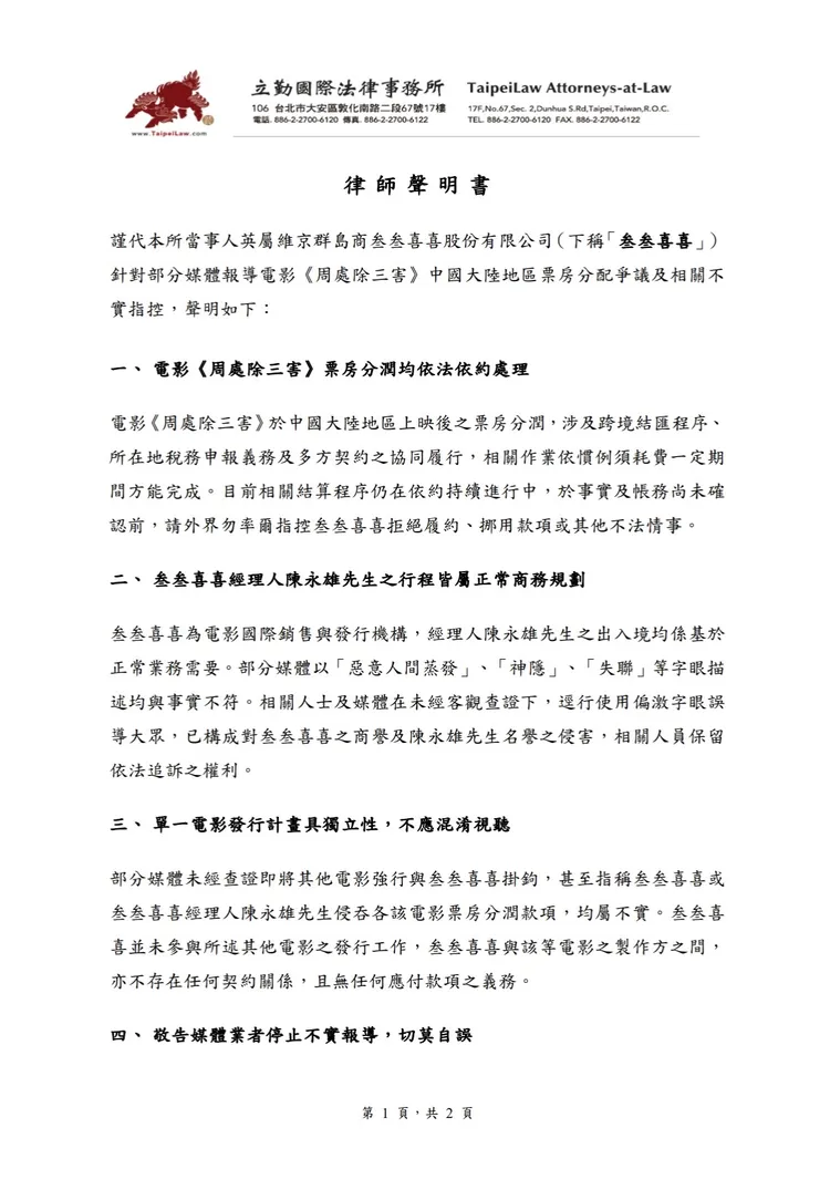 今(15日)陳永雄透過所屬的「叁叁喜喜」公司發表聲明,強調由於中國大陸地區的電影發行票房回收及跨境分配,涉及授權合約鏈、票房對帳、稅務處理、金流撥付節點及相關行政審核程序,實務上相對繁複,都需依照相關法規與程序辦理。相關作業仍持續處理中,否認有惡意拖欠、拒絕分帳一事,將對不實指控保留法律追訴權。