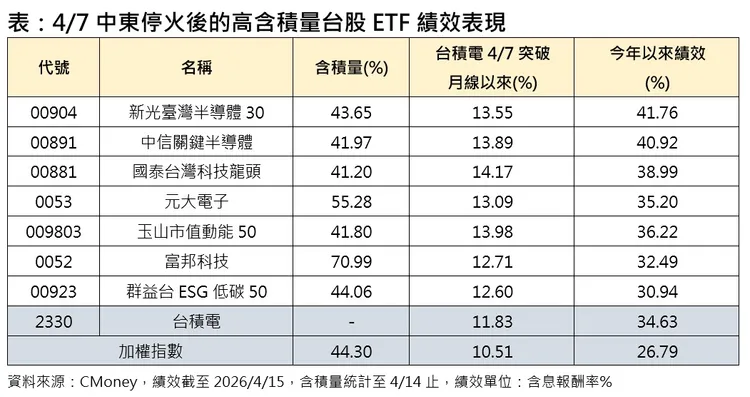 隨著台積電股價上攻,含積量超過4成的半導體ETF同步受惠,資金持續湧入。00904將於4月17日除息,每單位配發0.68元,帶動市場申購熱度升溫,受益人數頻創新高,4月16日為最後買進日,吸引投資人搶搭配息列車。
