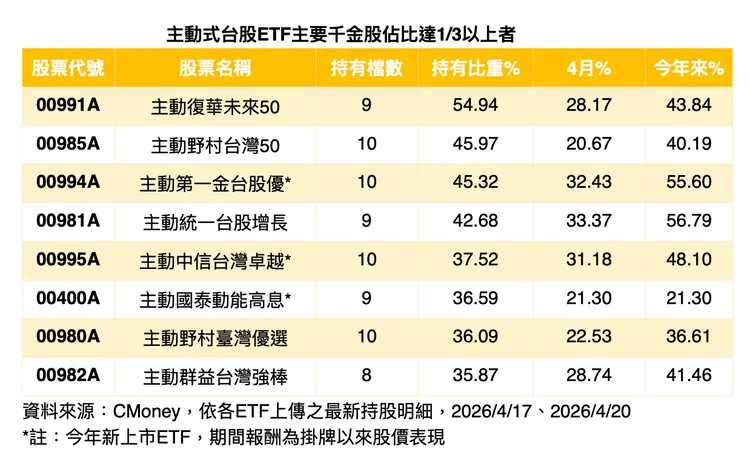 若以千金股持股比重觀察,主動復華未來50(00991A)持有比重高達54.94%居冠,其次為主動野村台灣50(00985A)45.97%與主動第一金台股優45.32%,顯示高價權值股已成績效關鍵。