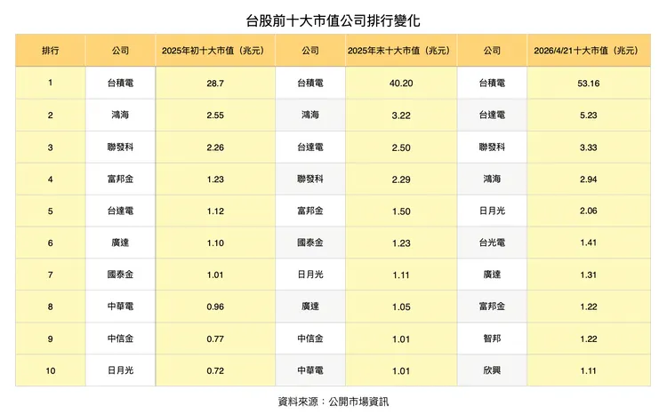 進入2026年,隨台股突破3萬點並持續創高,截至4月21日,市值排名變化更為劇烈。台積電市值大幅躍升至53.16兆元,穩居龍頭;台達電以5.23兆元躍居第二,反映AI電力與基礎建設需求強勁。聯發科3.33兆元排名第三,鴻海2.94兆元退居第四。日月光以2.06兆元擠進第五,其餘幾乎全由電子供應鏈主導,包括台光電(2383)1.41兆元、廣達1.31兆元分列第六、第七。金融股僅剩富邦金1.22兆元排名第八,智邦(2345)躋身第九,第十名則為欣興(3037)1.11兆元。