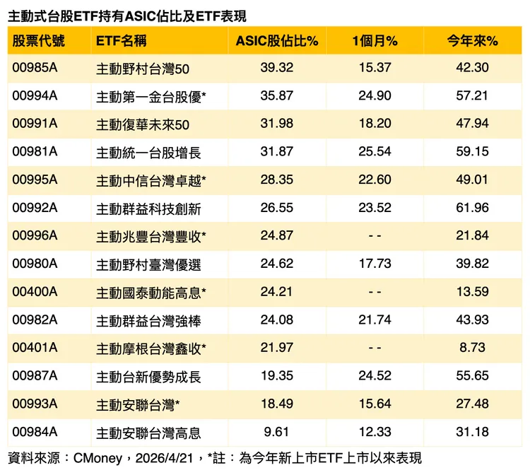 在此趨勢下,主動式台股ETF憑藉靈活選股優勢,成功掌握ASIC投資機會。根據統計,目前市場14檔主動式台股ETF中,ASIC相關持股比重大多落在20%至30%,其中配置較高者包括主動野村台灣50(00985A)約39.32%、主動第一金台股優(00994A)約35.87%、主動復華未來50(00991A)約31.98%及主動統一台股增長(00981A)約31.87%。