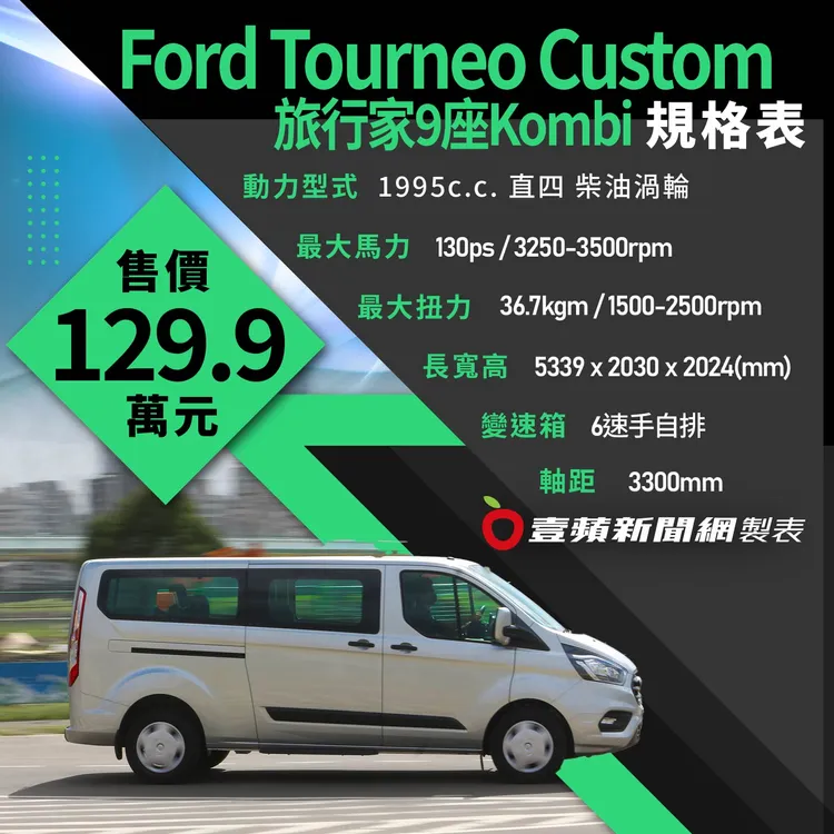這次全新導入的Ford Tourneo Custom福特旅行家九人座Kombi車型,車身依然維持長軸化的5339mm長度並未縮水,車寬2030mm、車高2024mm,整體營造出相當壯碩的大器視覺,而3300mm驚人的軸距,則能讓車內9人都保有適當充足的乘坐空間。